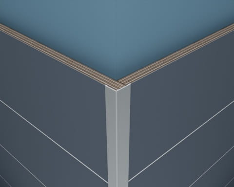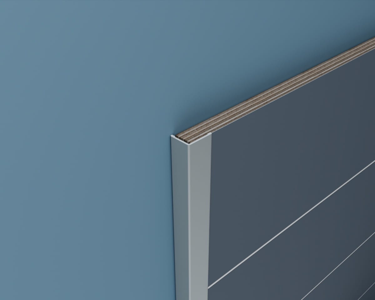 Perfekcyjnie wykończ krawędzie paneli łazienkowych Fibo. Zastosuj oryginalny profil zakończeniowy do wykańczania krawędzi o kolorze anodowanego aluminium.